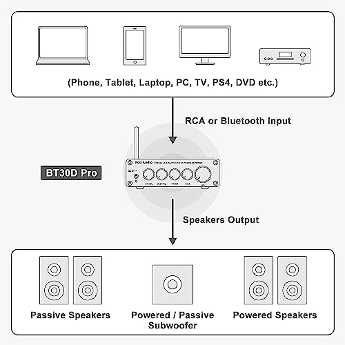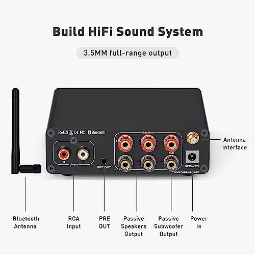 Advanced 2.1CH Bluetooth 5.0 Receiver Amplifier achieves HiFi music quality, the best choice for your home audio entertainment. You can connect passive speakers/passive subwoofer/powered speakers/powered subwoofer to DIY a stereo sound system.