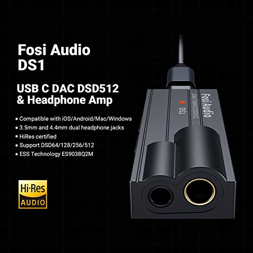 Fosi Audio DS1 DSD512 HiFi USB C DAC ES9038Q2M Mini Audio Headphone Amp Adapter Supports 32bit/768kHz with 4.4MM and 3.5MM Dual Headphones Outputs