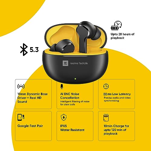realme TechLife Buds T100 Bluetooth Truly Wireless in Ear Earbuds with mic, AI ENC for Calls, Google Fast Pair, 28 Hours Total Playback with Fast Charging and Low Latency Gaming Mode (Black)