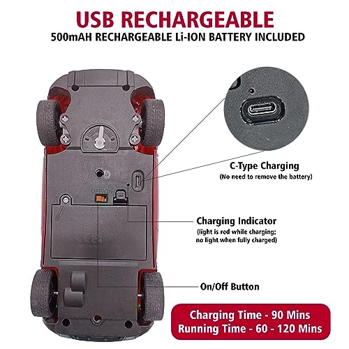 🏎️ Batteries: The remote-control car features a 500mAh battery, with a charging indicator that turns red during charging and remains off when fully charged. It takes approximately 90 minutes to charge from empty to full, providing a running time of 60 to 120 minutes.