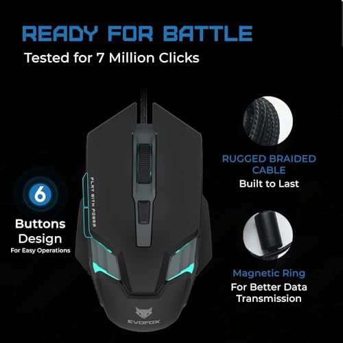 EvoFox Starter Series Spectre USB Wired Gaming Mouse with Upto 3600 DPI Gaming Sensor | 6 Buttons Design | Upto 7 Million Clicks | 7 Colours Rainbow Lighting with Breathing Effect | 1.5m Braided Cable (Black)