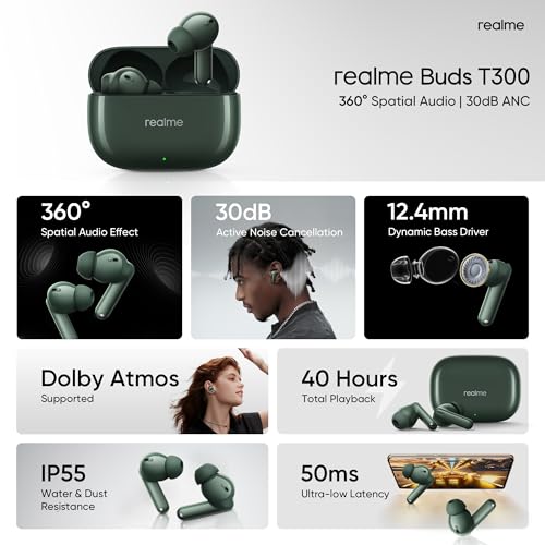 realme Buds T300 Truly Wireless in-Ear Earbuds with 30dB ANC, 360° Spatial Audio Effect, 12.4mm Dynamic Bass Boost Driver with Dolby Atmos Support, Upto 40Hrs Battery and Fast Charging (Dome Green)