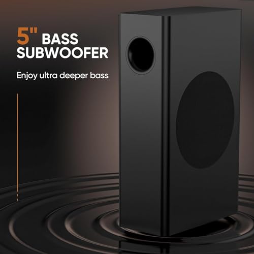 Deeper Bass with Dedicated Subwoofer-40 Watts:Our soundbar with subwoofer (total power 80 Watts) produces powerful bass and surround sound, and lets you enjoy an amazing home audio experience; The dedicated subwoofer cavity space is big enough to reproduce deeper, richer bass than most systems with a built-in subwoofer.